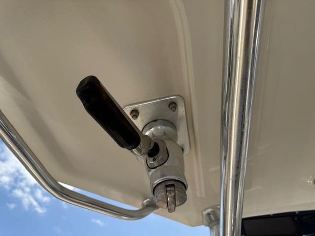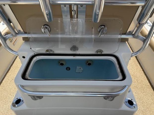 Aboard the 2510 Bay Ranger is a leaning post with bolsters at the helm and fold-down rear deck bench seating for two, which features articulating and self-storing armrests that deploy and retract with the folding of the seat. The skid-resistant deck and interior offers sure footing and easy clean up while the console, which features multiple color-coordinated panels for additional dream rig customization, offers space for flush mounting two displays with screen sizes up to 12 inches. Stainless steel compression lid locks, tie downs, fittings and molded-in trade dress are also standard throughout the vessel.