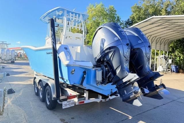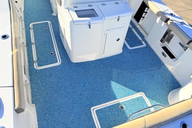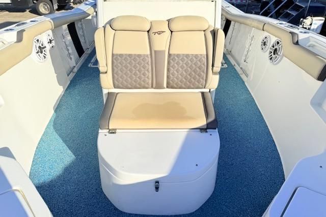 The 292CC combines a great fishing platform with plenty of seating. Starting at the bow, this boat provides passengers with large wrap around bow seating, electric Hi-Low table, stow-away backrest, and large console lounge seat, usb charging. The yacht style helm station features two levels of footrest, laser cut switches, and plenty of room for up to two 16" MFD's. The leaning post connects with the tee top mimicking our 320CC and providing users with a very solid base. Two insulated floor macerated fish boxes, a side tuna door, and fold down rear bench seat complete this boat from mid-ship to stern.