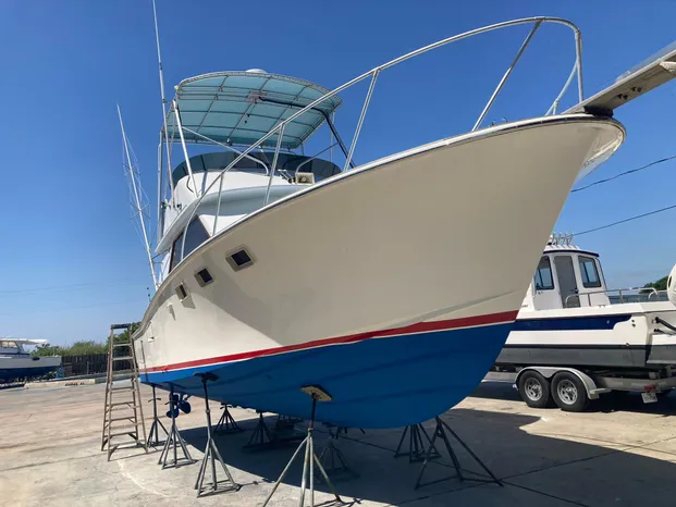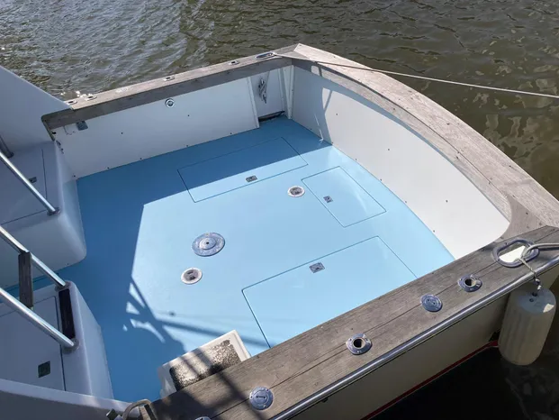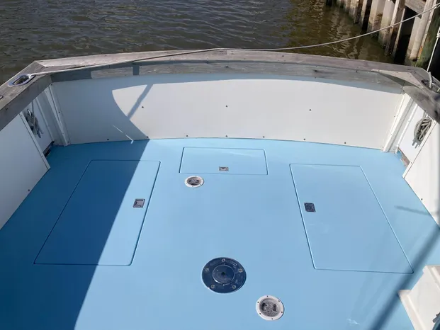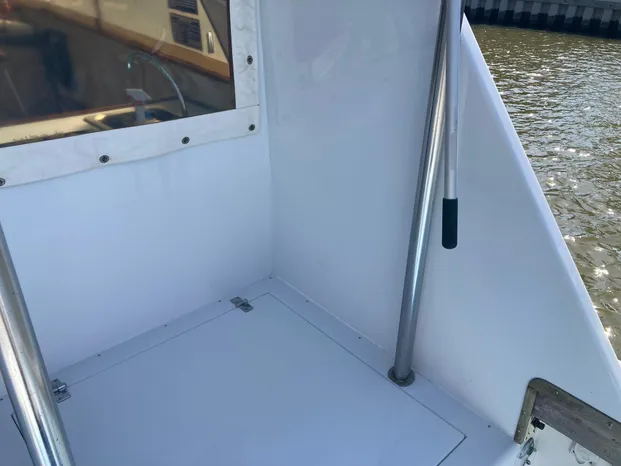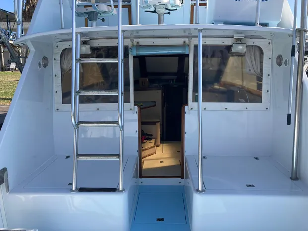 - Flybridge with a Custom Aluminum Half-Tower with (2) helm chairs, forward center-line helm and a fiberglass storage box