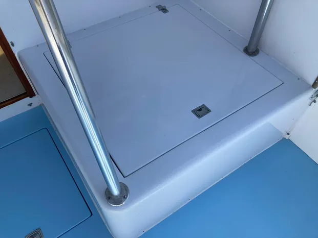 Entering the salon from the cockpit, immediately to port is the booth style dinette/settee that converts to sleep (2). Across to starboard is a builtin wet bar area with storage and tackle center drawers under. Moving forward and down (3) steps is the galley area to starboard with excellent storage, a cold plate in-counter dual voltage refrigeration box and a coffee pot. Across to port is the private head with sink, vanity, mirror, storage and shower. Moving forward is the forward stateroom with a large V-berth, (2) closets and abundant storage drawers. Stereo System.