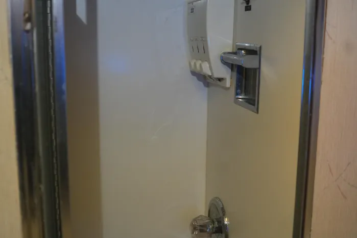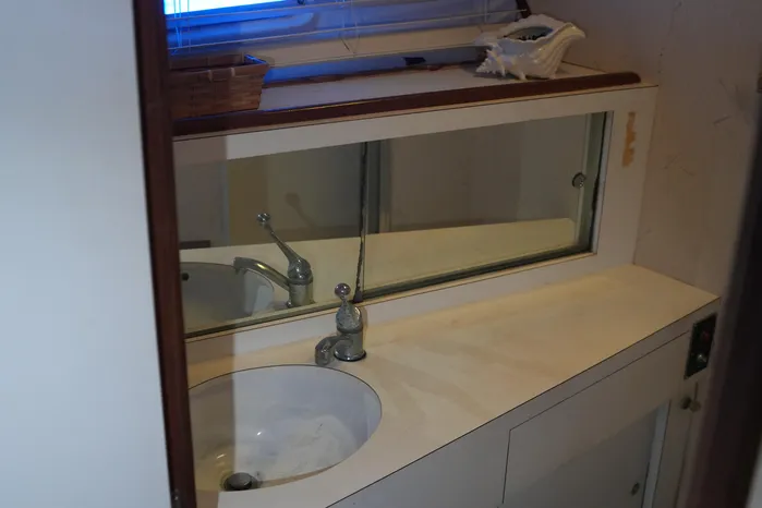 - Sink, ample counterspace, sliding cabinetry below, and sliding mirrored cabinetry with shelving above
