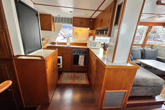 Entry into the salon is via the starboard door at the lower steering station or a door off of the aft sundeck. The salon/galley area features a large salon and a U-shaped full service galley is aft to port. The full galley offers a huge amount of storage and all the amenities for meal preparation. Lining the starboard side of the salon from the aft companionway to starboard sliding door is a very ornate teak set of drawers and cabinetry. The yacht finished teak helm station offers a commanding view out and forward as well to port and starboard. Portside is the L-shaped settee and table. Down and forward to port is a laundry locker that abounds with stowage for gear, clothes, linens, etc. Across, to starboard, is the large guest head with an electric toilet, basin and separate shower stall with a teak seat and grate incorporated. Also, forward are the wide and comfortable v-berths with hanging lockers to port and starboard . Contributing to the classic feel of the Island Gypsy styling is the teak planked ceiling outboard the v-berths. Aft of the salon and down the aft companionway, is the full beamed, fully accommodating master stateroom with a full queen-sized berth, matching night stands and port/starboard hanging lockers, stowage and drawers. Uniquely incorporated into the companionway to the master stateroom is a handy pocket broom closet and a door leading to the engine room under the stairway. In the forward area of the stateroom to starboard is a desk/vanity with a drawer and mirror. The master head is forward to port and generously sized with electric toilet and a separate shower stall. In the master stateroom and head, there are (8) opening that provide ample light and air circulation when opened. There is also an escape hatch that opens to the sundeck.
