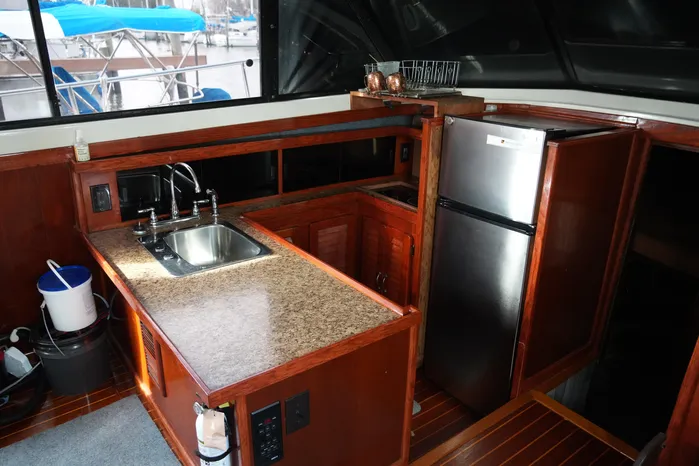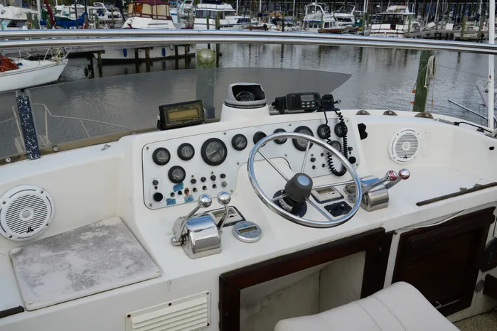 - Helm station with wheel, throttle, and captain and co-captain chair