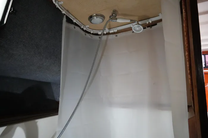 - Shower hose, curtain, full stand-up shower with integrated seating
