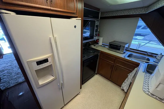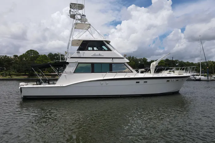 A hugely successful model for Hatteras with over 125 built, the Hatteras 60 Convertible is the ideal combination of all-out sportfishing machine and luxury cruising yacht. Offered with an open or fully enclosed flybridge, her expansive three-state-room, three-head interior is arranged with the galley and dinette on the deckhouse level and an amidships master stateroom. A separate utility room forward of the engine compartment houses the air-conditioning compressors, washer/dryer, etc., with room to spare. Additional features include a deep keel for prop protection, fore and aft flybridge helm stations, and a queen berth in the master stateroom. Her massive cockpit (175sq.ft) provides direct access to the well-arranged standup engine room. (PowerBoat Guide)