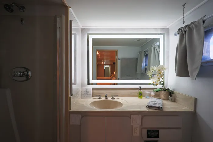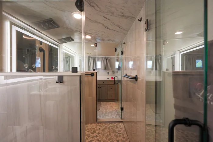 Master Stateroom: The elegantly appointed and spacious Master Stateroom features a king size bed, settee, ample drawer and closet storage, “his and hers” en suite bathrooms, and entertainment center.
