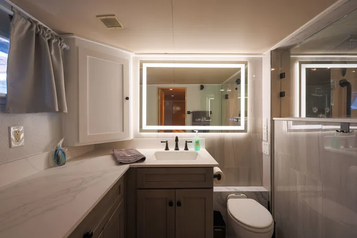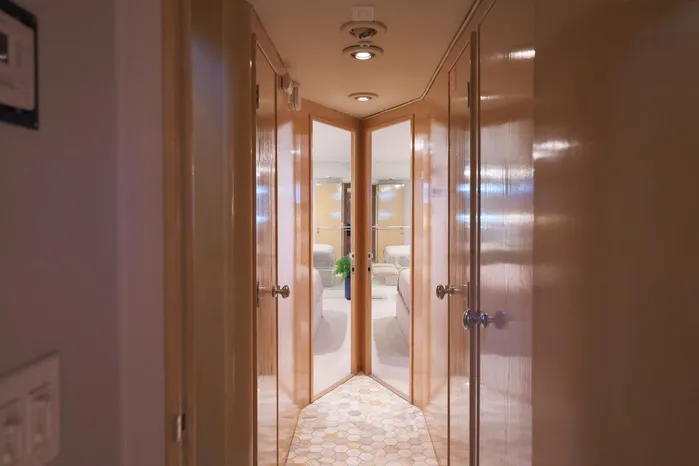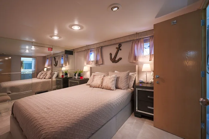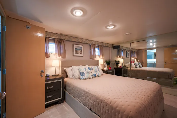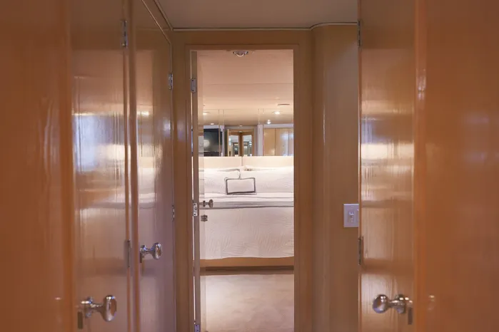 A staircase forward and starboard in the main salon leads below to the guest accommodations with a contemporary light wood and cream-colored carpeting. At the base of the stairs, the foyer has two storage lockers and a washer and dryer concealed in a cabinet. The Master Suite is full beam, amidships, with a centerline king bed flanked by marble-topped night tables and backlit etched glass panels above. Drawer storage is abundant with built-in dressers on both the port and starboard bulkheads. A dressing table is centered between the drawers to port, and a settee is centered to starboard. There are large cedar-lined hanging lockers aft as well as an entertainment center.