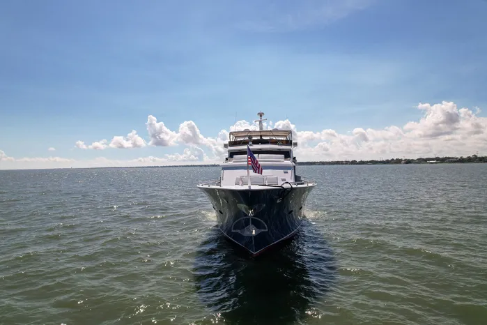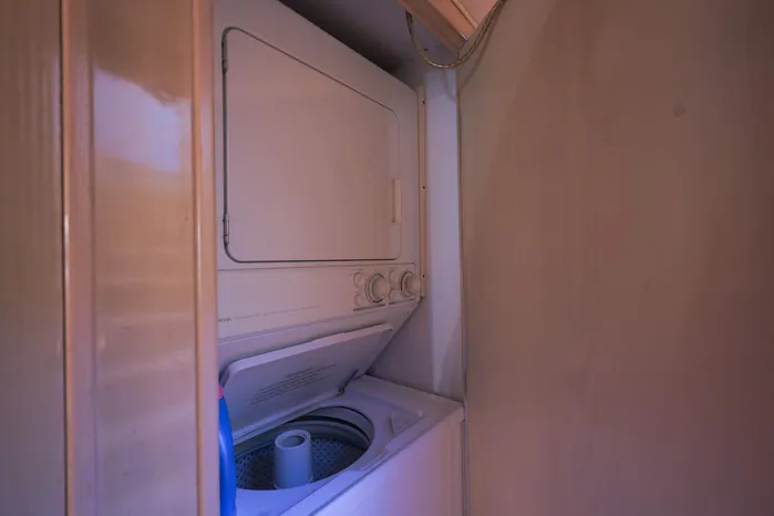 Fully forward starboard is a curving stairway leading below to the Crew Quarters. The forward crew cabin has twin V-berths with storage below and hanging lockers. There is a head with shower and a washer and dryer. Aft is the Captain’s Cabin with double berth to port and office/entertainment area starboard. The Engine Room access is via the watertight door from the Captain’s Cabin.