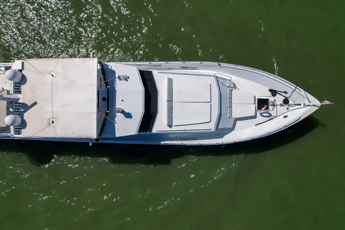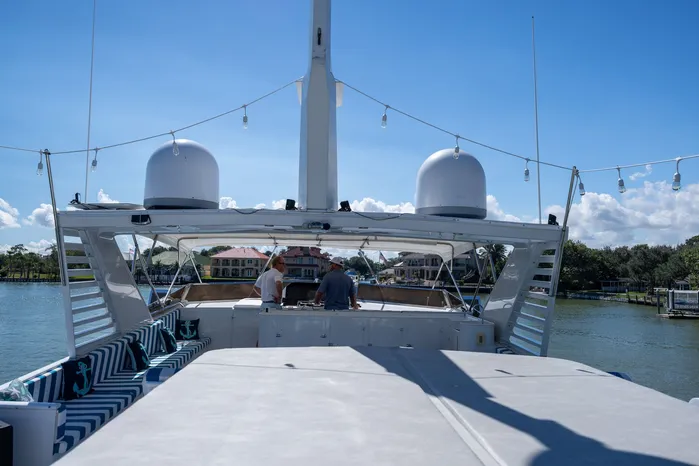 La Vidas spacious flybridge is ideal for outdoor entertaining with comfortable seating for a large crowd. The Flybridge affords the helmsman 360-degree vistas and the extra large Bimini top protects all assembled. There are dual pedestal helm chairs and a full array of navigation equipment. The hinged mast allows access to more cruising routes. A large cabinet surrounds the mast and houses many storage lockers, a wet bar, icemaker, refrigerator and barbeque grill. There are Sunbrella cushioned settees both port and starboard, a teak table with chairs. Additional seating running full beam aft, is without cover and perfect for sunning.