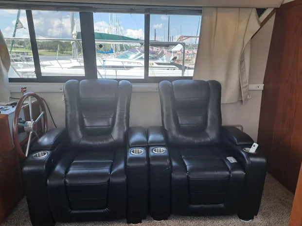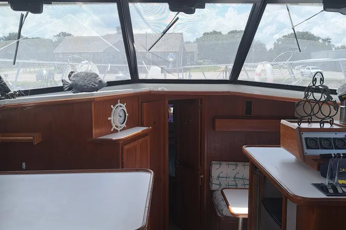The main salon is open and airy, with large windows offering excellent natural light and panoramic views. The galley is fully equipped with modern appliances, making meal prep a breeze, while the dining area provides a comfortable space for meals with family and friends. Outside, the flybridge is spacious with plenty of seating and excellent visibility for easy cruising. The aft deck offers additional space for relaxing or entertaining, complete with a full enclosure for added protection from the elements.