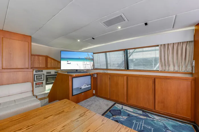 2 stateroom 2 head layout. New headliner in the salon 2023 Master stateroom forward with island queen berth, storage underneath, hanging locker, flatscreen TV, and private head. Head is electric with vanity and stall shower. Aft to port is the guest head followed by the guest stateroom with side by side single berths, storage, flatscreen TV, and hanging locker. Across to starboard is galley down with large pantry. Steps up to salon with huge U-shaped couch to port running the length of the salon with storage and rod locker underneath. Large flat screen TV and electrical panel on the starboard side.