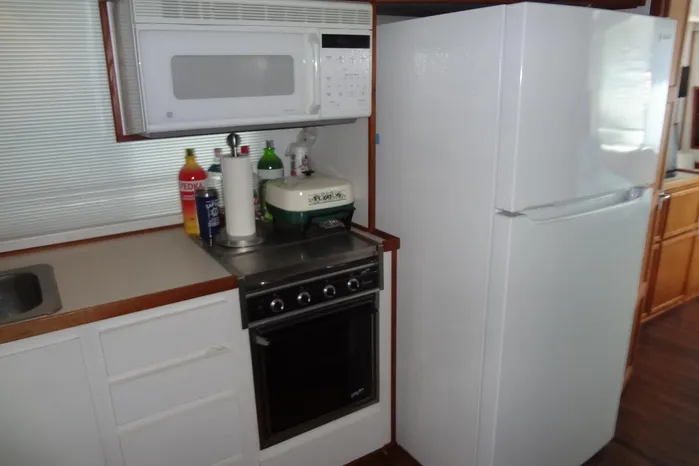 Galley includes stove/oven, full-size refrigerator/freezer, microwave, sink, storage, breakfast bar, and dining area