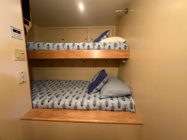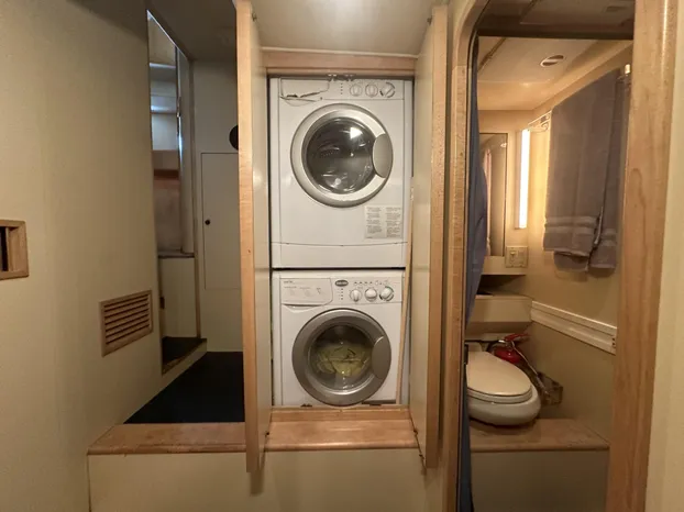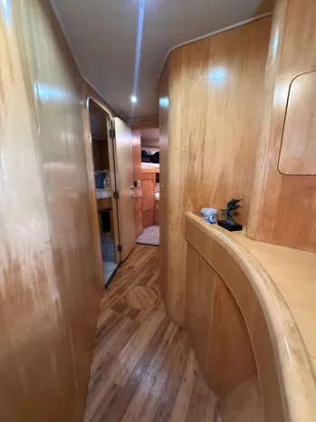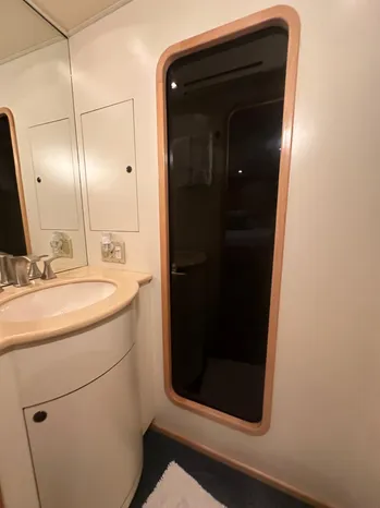 To port, is the crews quarters, crews head, laundry and a walk-through door to the engine room. Moving down the companionway to port is the mid-ship master stateroom and the en-suite master head. Moving forward and to port is the VIP guest stateroom with the en-suite guest head. Moving all the way forward is the forward day/quest head and the forward guest stateroom.