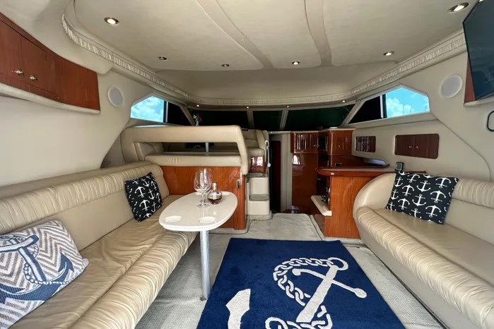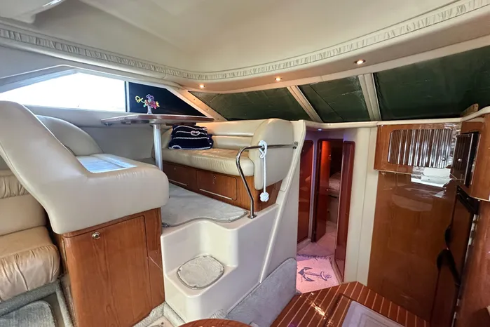 Her interior is spacious & has an upscale feel throughout. She has (two) staterooms with the master stateroom forward with private ensuite head and separate shower stall. The master stateroom also features a walk-around queen berth, flat screen TV, excellent drawer, cabinet and hanging locker storage.