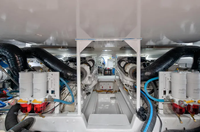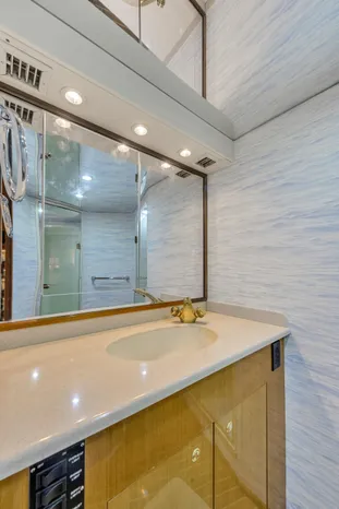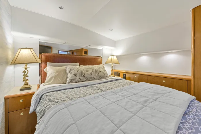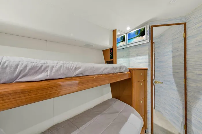 Down the companionway you have the old washer/dryer closet converted to tackle storage. On the port side is the master bedroom with ensuite head and on the starboard side you have bunk room with entry into the shared head. All the way forward is the VIP stateroom with cross over bunks and access to the head.