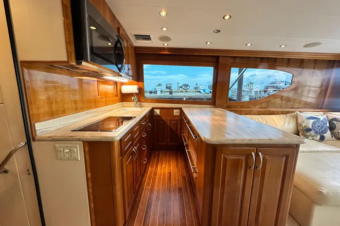 The salon and galley, as well as the rest of her (3) stateroom interior, feature high-gloss cherry woodwork and cabinetry, upgraded Amtico teak & holly flooring and upgraded natural stone counter-tops & vanities
