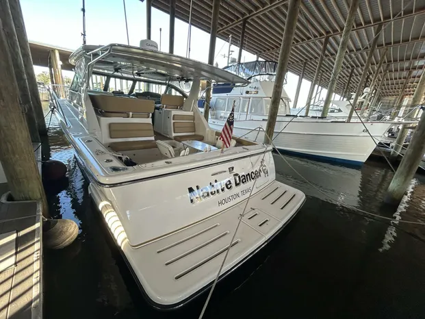Tiara is one of the country’s premier builders of dual-purpose express boats with hard-core fishing capabilities and beautifully crafted interiors. Like all of Tiara’s Open models, the 3800 can be ordered as a tournament-ready fishing machine or equipped with the cruising amenities of a comfortable family express. Her elegant single-stateroom interior is dominated by a huge U-Shaped settee to starboard, opposite the galley. There’s a separate stall shower in the head, and the beautiful teak-and-holly cabin sole gives the interior of the 3800 a traditional feel found in few other boats. The cockpit, with about 70 sq. ft. of space, can be ordered with an aft-facing jump seat or a complete tackle center. The entire helm-deck lifts mechanically for easy access to the large engine room. She has a cockpit wet bar, a fold-down transom seat, transom door and shower, side exhausts and wide side decks.