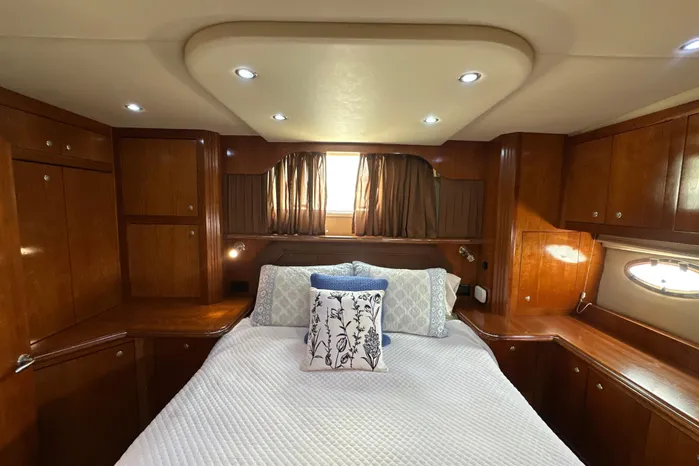 Queen-sized centerline island berth with easy access from both sides, private head and separate shower, excellent storage throughout and plenty of cherry woodwork and natural lighting.