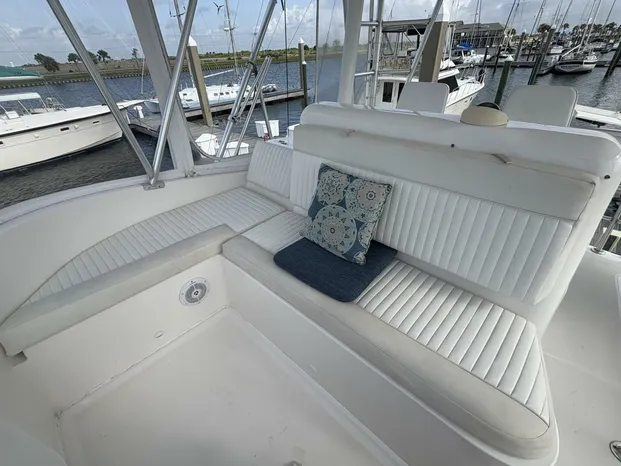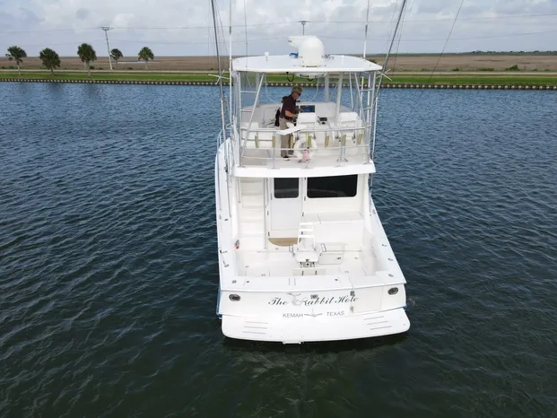 Offshore anglers will find a lot to like in the Luhrs 41 convertible, beginning with her rakish good looks and including a spacious interior and good open-water performance. Heavily built on a modified-V hull with prop pockets and a wide 15’, 9” beam, the two-stateroom interior of the Luhrs 41 includes a large master stateroom forward with an island berth and two big hanging lockers. The U-Shaped galley is forward in the salon which has an ultra leather sofa, twin barrel chairs, and a full entertainment center with a flat screen TV. Salon flooring is a rich teak and holly sole, washer/dryer unit. Topside, the 85 square foot cockpit has two large fish boxes in the sole and two smaller boxes in the transom. A tackle center is forward with LiveWell and sink, and a portside stairway leads up to the bridge with an L shaped bench seat forward of the helm console. A hardtop is standard. Note that the engine room of the Luhrs 41 is particularly well arranged. (Powerboat Guide)