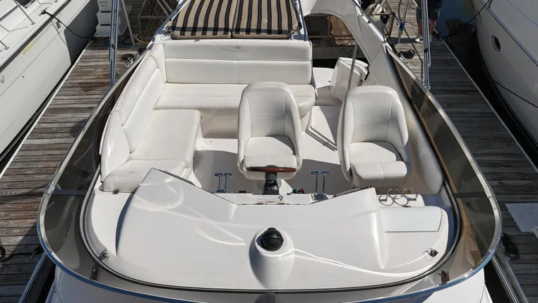 Engine room access is from the cockpit via a center quick access hatch with port and starboard main engine hatches. Stainless steel railing and grab rails with ample gunwale width provides safe access to the bow deck.
