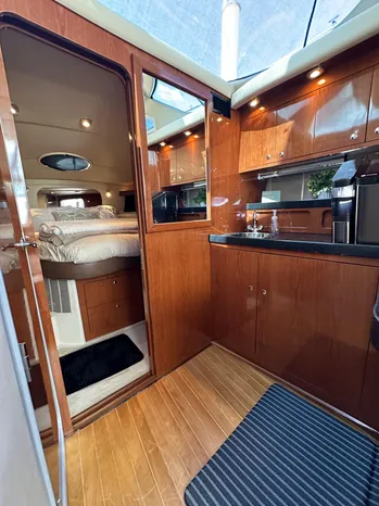 Stepping aboard "Barbie Hunter" you will find a spacious cockpit with fold down transom seating, a hinged transom door leading to the swim platform and molded fiberglass steps providing easy access to the large flybridge. Entering the full-beam Salon through the acrylic sliding door, there are is a spacious U-Shaped sofa to port (converts to a double berth to sleep two) and (2) barrel chairs to across to starboard. The Galley is forward of the salon, down one step to starboard, and overlooks the salon. Across to port, is the private access to the Guest Stateroom, that features two side by side single berths (with cushions to convert to a single queen berth, excellent storage and a hanging closet. Forward of the Guest Stateroom is access to the Private Head and Shower, which also has ensuite access from the Master Stateroom. The Master features an center-line island queen berth,TV, his and hers hanging closets and additional storage compartments.