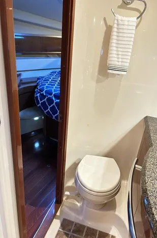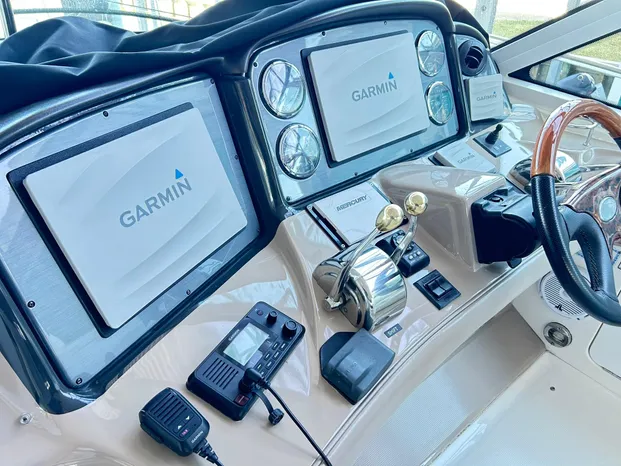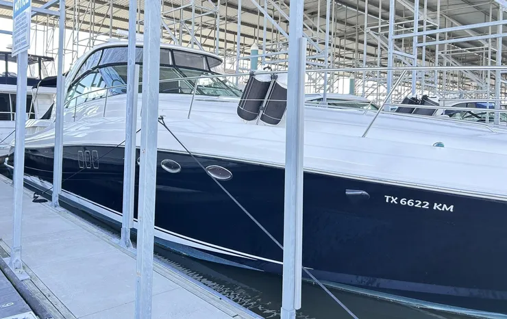 The 52 Sundancer takes a back seat to few when it comes to luxury and open-water performance. Built on a deep-V hull with prop pockets to reduce the shaft angle, the Sundancer's innovative cockpit layout is notable. Arranged with a unique rotating lounge, the cockpit forms a single entertaining area rather than the divided space found in other express yachts. Another major change is found below — instead of the ubiquitous mid-cabin floorplan found in most express cruisers this size, both of the Sundancer's staterooms are forward. While there is a foldout bed option aft, this area is now part of the main salon making it even more expansive than before with posh Ultraleather sofas, 6'8" headroom, and built-in flat-screen TV/DVD. There are two full heads in this layout, and the galley includes plenty of storage as well as a hardwood floor. An extended swim platform, cherry interior cabinets, and fiberglass hardtop were standard. A well-finished yacht, Cummins V-drive diesels cruise the Sundancer at 26–28 knots (30+ top).