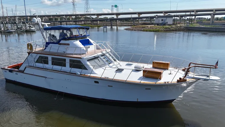 - Custom fiberglass walk-around flybridge helm with bimini top, full (4) sided enclosure and custom aluminum hand rails & teak decks