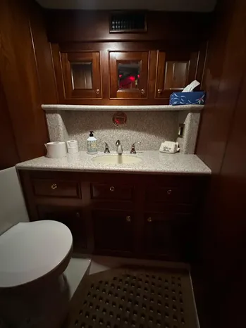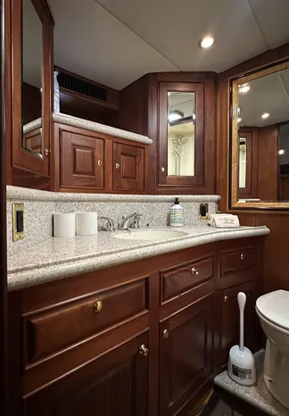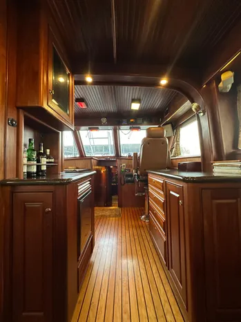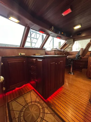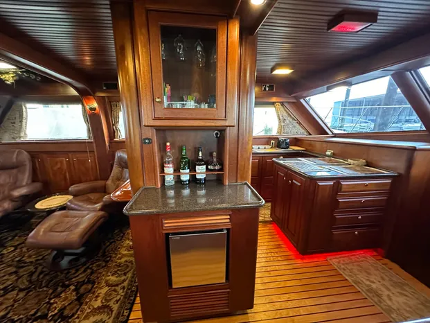 Entering through the custom teak cockpit swing door, is the very spacious salon, which is truly nothing less than amazing, with her custom woodwork, cabinetry and the custom hardwood flooring. Even the headliner is done in custom woodwork. There is custom cabinetry with storage throughout, large flat screen TV, entertainment center, custom wood valances and custom blinds & window treatments. The TV raises and lowers into a custom cabinet. Forward to the salon to starboard, is the custom lower helm with controls, gauges, electronics and a Stidd Captains helm chair. Forward of the salon to port, are more storage cabinets, dining bar with custom wood counter-tops. The u-shaped galley is forward to port and across from the starboard helm. The galley is on the same level and overlooks the salon.