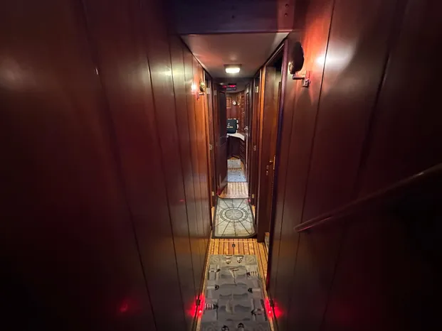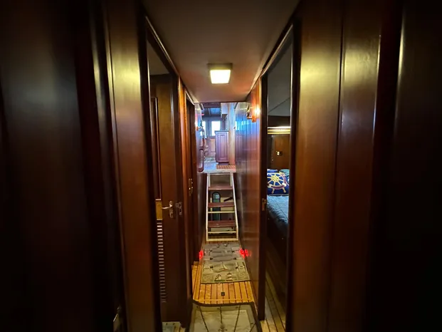 Moving forward and down the custom wooden steps is the companionway, which leads to the (3) Stateroom and (3) heads. Custom wood walls and flooring.