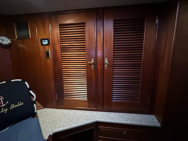 - Custom teak woodwork - aft bulkhead and aft bulkhead storage cabinets with granite tops