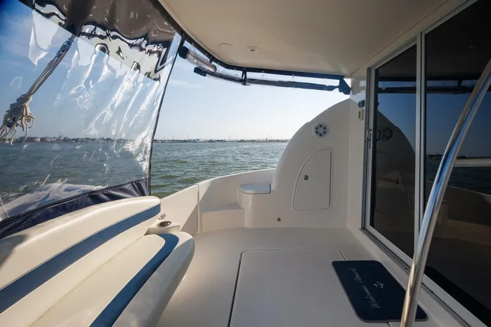 - The flybridge’s distinctive overhang offers more space topside as well as cockpit weather protection, and its molded-in steps are hinged to provide direct engine-room access.