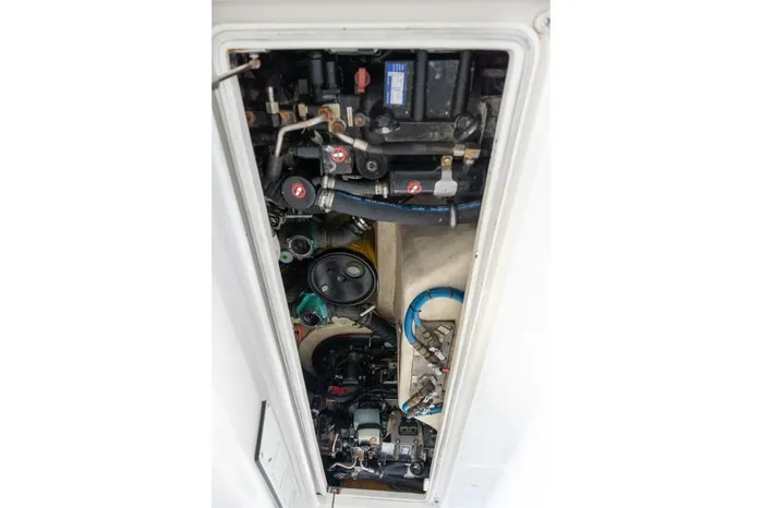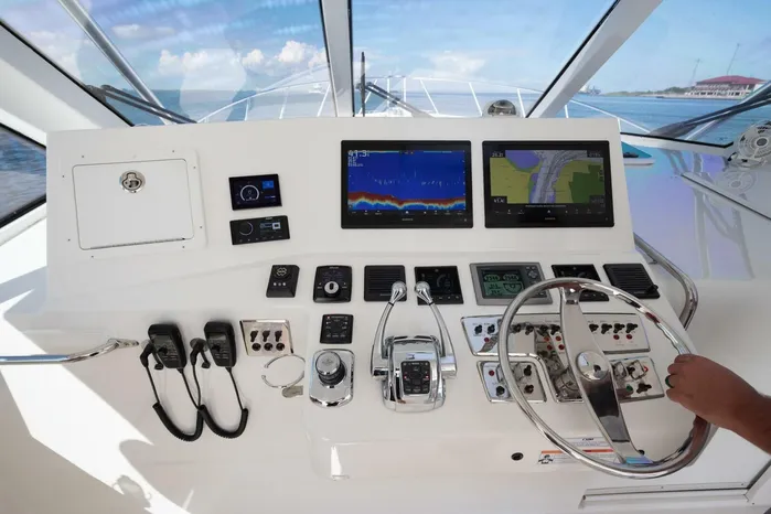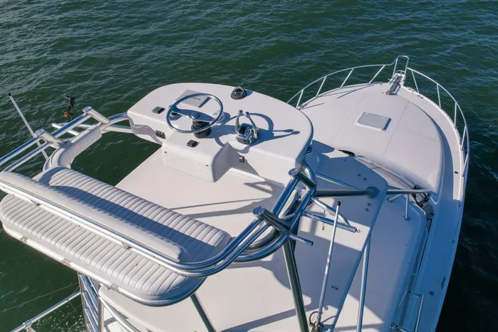 - Molded fiberglass helm deck, hydraulically lifted with cockpit control unit