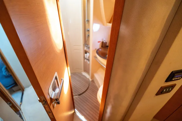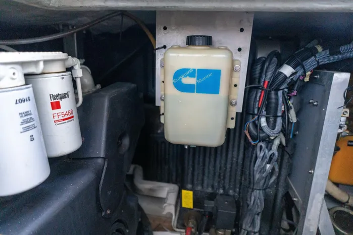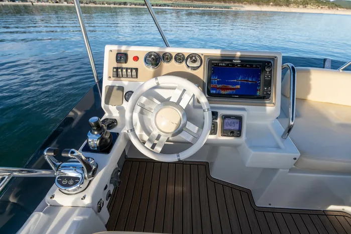 - Cummins ETS engine remote controls with rev synchronization, CUMMINS Vessel View engine control display (rev counter, battery pack voltage, consumption, various alarms, engine and marine gear pressure and temperature, environment temperature, generator parameters display, fuel gauge, interface with Raymarine instruments for independent calculation, water in fuel filter alarm), magnetic compass, Raymarine TRIDATA ST60 display (echo-depth-speed), pilot's seat light bypass switch, horn control, instrument light control, winch control, windshield wiper and washer, navigation and anchor lights control, red antiglare night-time navigation light control, alarm mute light, available AUX control, bilge pump controls and lights, navigation light controls, magnetic compass, trim tabs control and trim indicators, 12 V socket