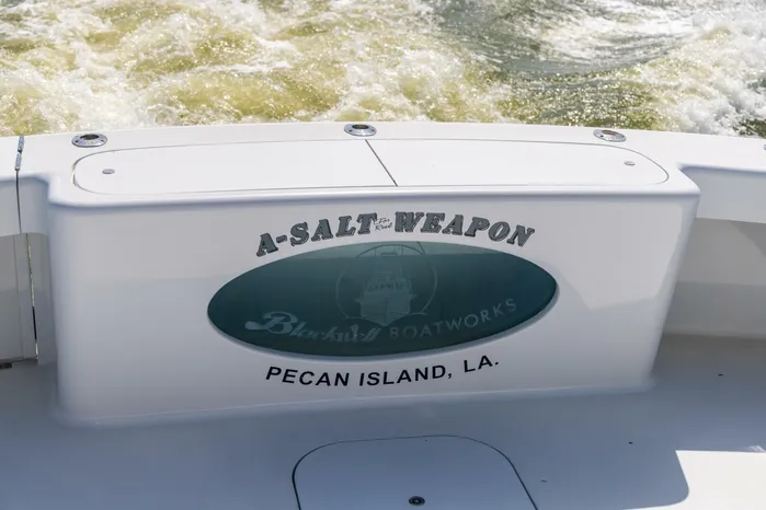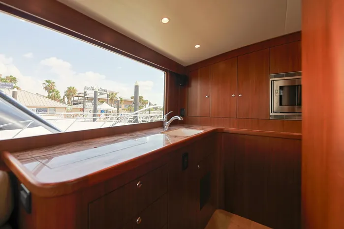 - Starboard tackle storage cabinet with drawers and lid that raised electronically to show electronics screen.