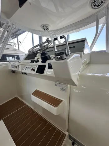 - Full Upper Molded Fiberglass Helm Station with Storage Cabinet, Stainless Steel Steering Wheel, Compass, Electronic Engine Controls, Joystick Controller, Trim Tab Controls, Stereo Remote Control, and Flush Mounted Electronics