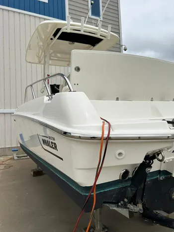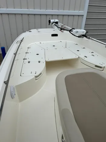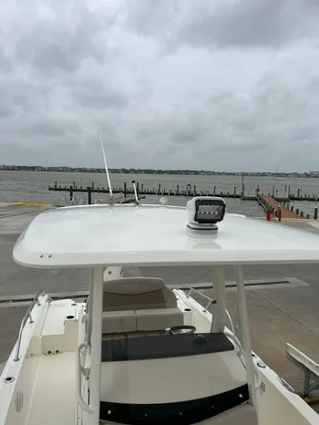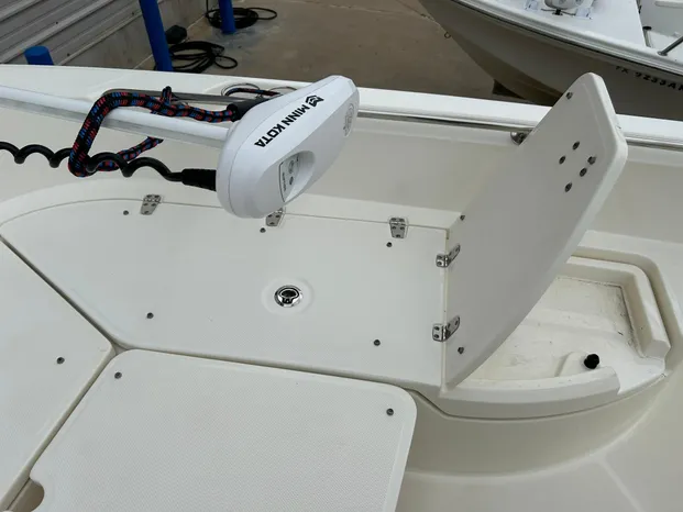 - Leaning post – includes: aluminum frame, cup holders (2), dual seats, fiberglass storage compartment, grab rail, removable backrest, rod holders (4), YETI cooler (94 qt), stern seat with folding backrest