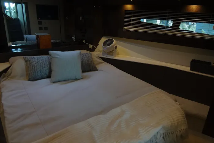 Staterooms / Cabins: 3 stateroom layout. Master suite (aft, full beam, walk-around queen), VIP forward (queen), third stateroom with twin / bunk beds.