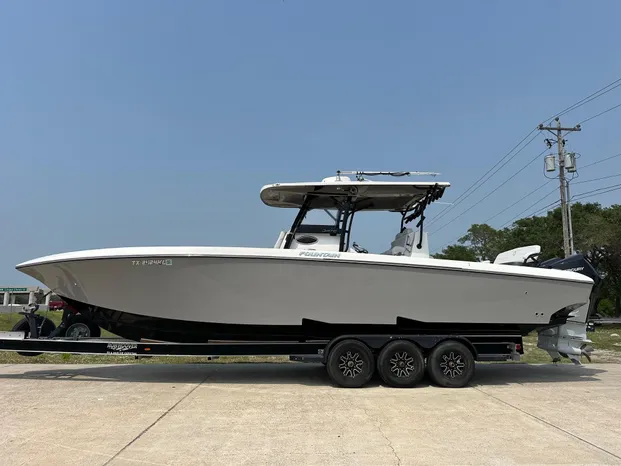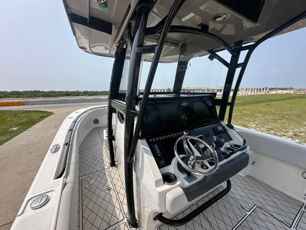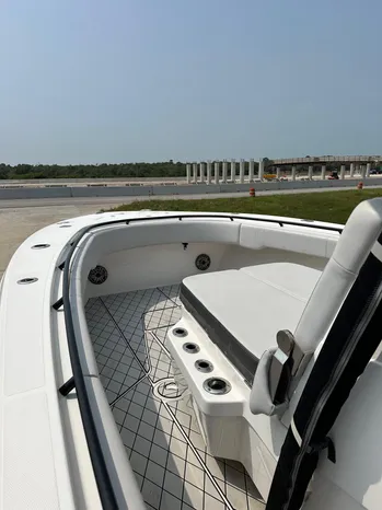 Forward lounge seating in front of the console with storage below and 8 rod holders on the sides