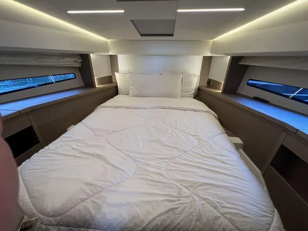 On the exterior, she features the signature style of the latest PRESTIGE Yachts, with an expanded, continuous line of windows in the hull. This Flybridge integrates the concept of the L-shaped cockpit, which allows for maximum use of space. Transformable into a very large aft sundeck, this cockpit can also house a fully equipped skipper cabin.