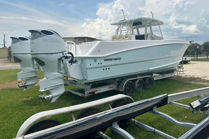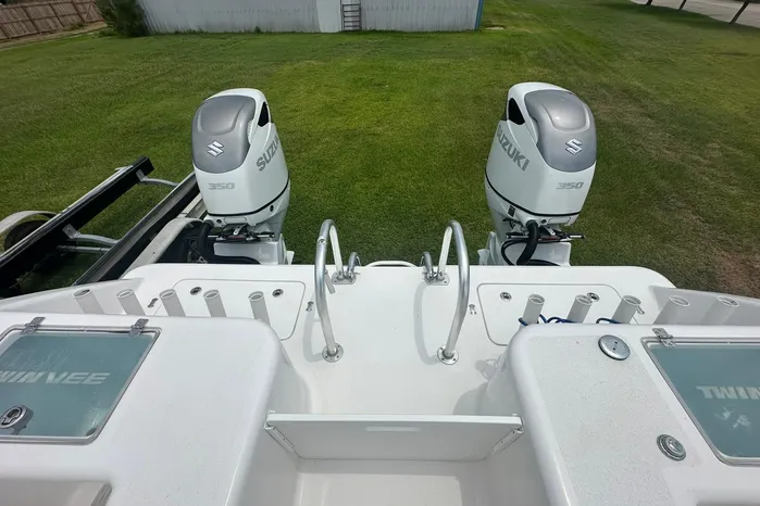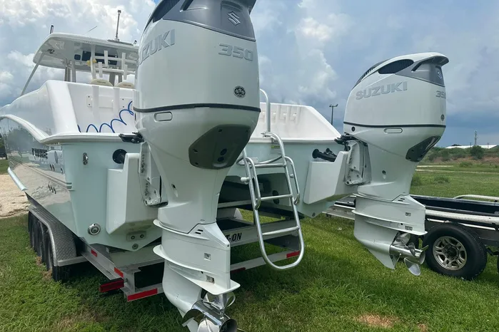- Twin Fusion White Suzuki DF350ATXXW4 350hp Four-Stroke Counter Rotating Outboard with (4) Blade Stainless Steel Duo-Props (under factory warranty until 2027)