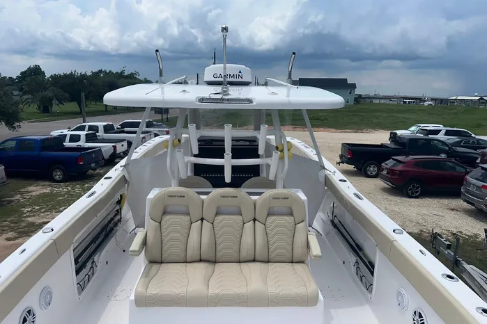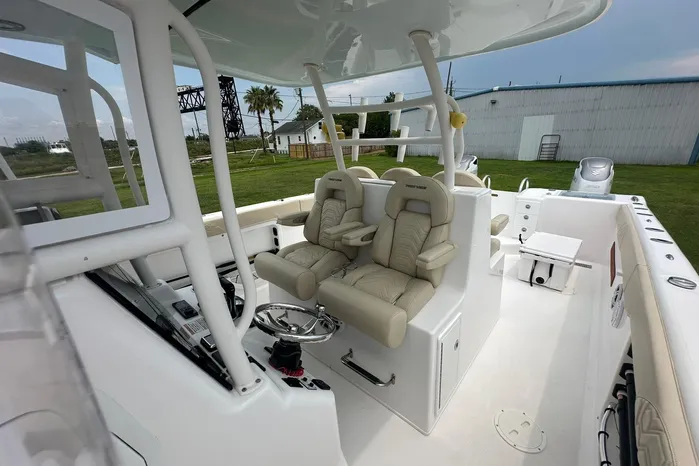 - Over-Sized T-Top with Molded Fiberglass Hardtop (Forward & Aft LED Spreader Lights, (6) Aft Support Rails Mounted Rocket Launchers, Aluminum is White Powder Coated, Overhead Electronics Box