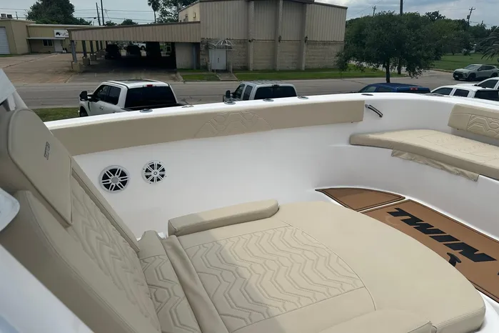 - Forward of the Helm Station, Coffin-Box Styled Large Custom Upholstered Sun Lounger with Insulated Storage or Another Fish Box Underneath