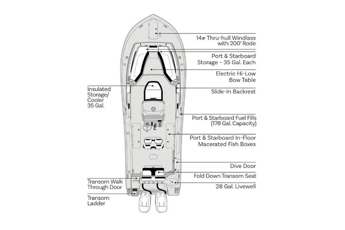 The 272 CC Adventure key features include hi-low bow table, lounge console w/insulated cooler, in-floor macerated fish boxes, dive door and much more!
