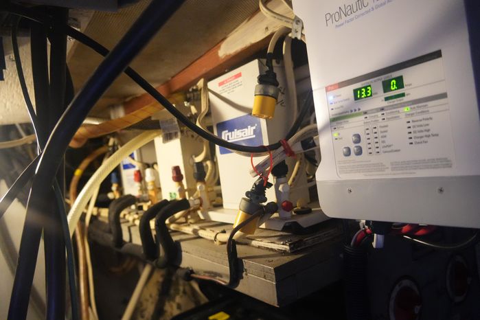 - Large anchor on sprit, Ideal electric windlass, and chain, rode