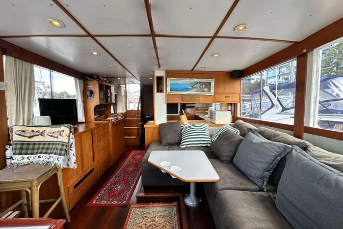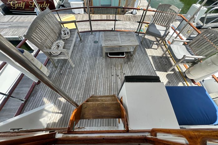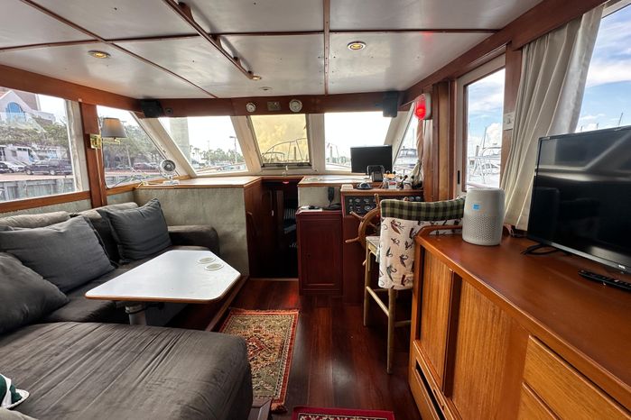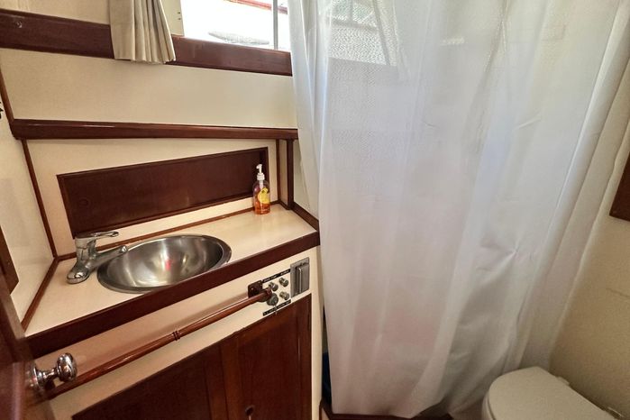 Entry into the salon is via the starboard door at the lower steering station or a door off of the aft sundeck. The salon/galley area features a large salon and a U-shaped full service galley is aft to port. The full galley offers a huge amount of storage and all the amenities for meal preparation. Lining the starboard side of the salon from the aft companionway to starboard sliding door is a very ornate teak set of drawers and cabinetry. The yacht finished teak helm station offers a commanding view out and forward as well to port and starboard. Portside is the L-shaped settee and table. Down and forward to port is a laundry locker that abounds with stowage for gear, clothes, linens, etc. Across, to starboard, is the large guest head with an electric toilet, basin and separate shower stall with a teak seat and grate incorporated. Also, forward are the wide and comfortable v-berths with hanging lockers to port and starboard . Contributing to the classic feel of the Island Gypsy styling is the teak planked ceiling outboard the v-berths. Aft of the salon and down the aft companionway, is the full beamed, fully accommodating master stateroom with a full queen-sized berth, matching night stands and port/starboard hanging lockers, stowage and drawers. Uniquely incorporated into the companionway to the master stateroom is a handy pocket broom closet and a door leading to the engine room under the stairway. In the forward area of the stateroom to starboard is a desk/vanity with a drawer and mirror. The master head is forward to port and generously sized with electric toilet and a separate shower stall. In the master stateroom and head, there are (8) opening that provide ample light and air circulation when opened. There is also an escape hatch that opens to the sundeck.