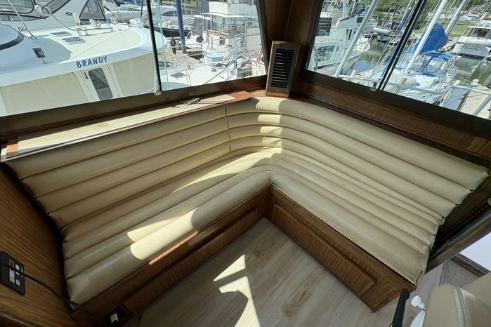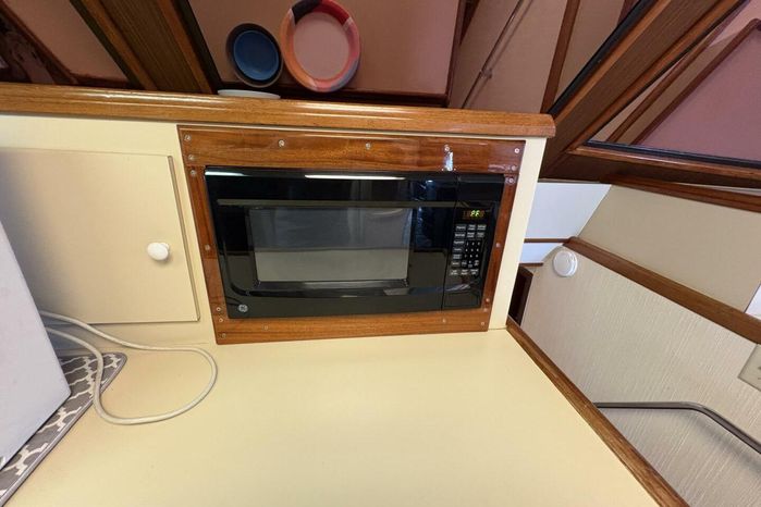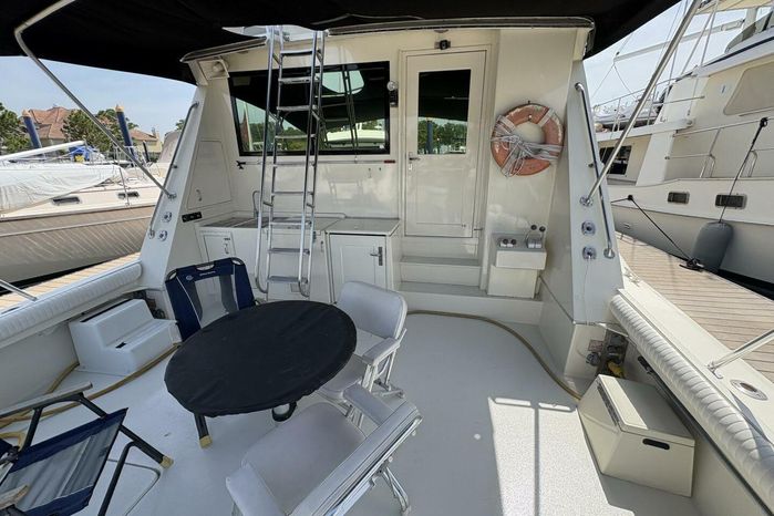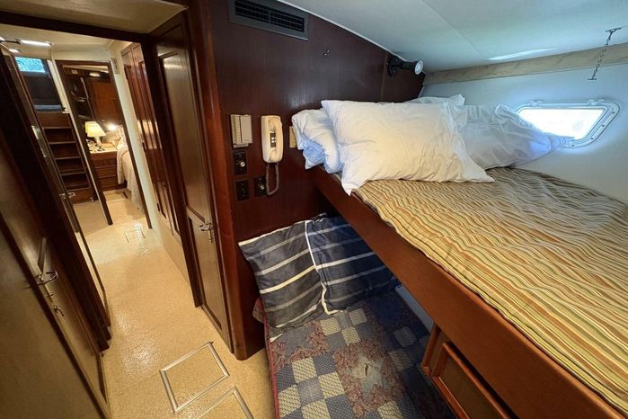 A hugely successful model for Hatteras with over 125 built, the Hatteras 60 Convertible is the ideal combination of all-out sportfishing machine and luxury cruising yacht. Offered with an open or fully enclosed flybridge, her expansive three-state-room, three-head interior is arranged with the galley and dinette on the deckhouse level and an amidships master stateroom. A separate utility room forward of the engine compartment houses the air-conditioning compressors, washer/dryer, etc., with room to spare. Additional features include a deep keel for prop protection, fore and aft flybridge helm stations, and a queen berth in the master stateroom. Her massive cockpit (175sq.ft) provides direct access to the well-arranged standup engine room. (PowerBoat Guide)