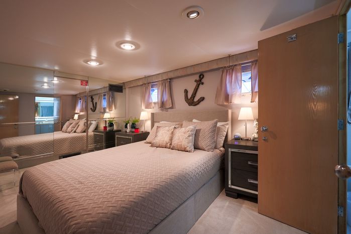 A staircase forward and starboard in the main salon leads below to the guest accommodations with a contemporary light wood and cream-colored carpeting. At the base of the stairs, the foyer has two storage lockers and a washer and dryer concealed in a cabinet. The Master Suite is full beam, amidships, with a centerline king bed flanked by marble-topped night tables and backlit etched glass panels above. Drawer storage is abundant with built-in dressers on both the port and starboard bulkheads. A dressing table is centered between the drawers to port, and a settee is centered to starboard. There are large cedar-lined hanging lockers aft as well as an entertainment center.