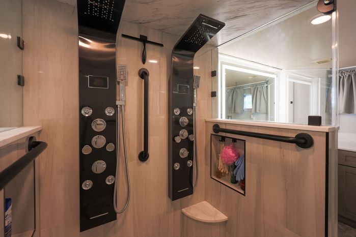 Master Stateroom: The elegantly appointed and spacious Master Stateroom features a king size bed, settee, ample drawer and closet storage, “his and hers” en suite bathrooms, and entertainment center.