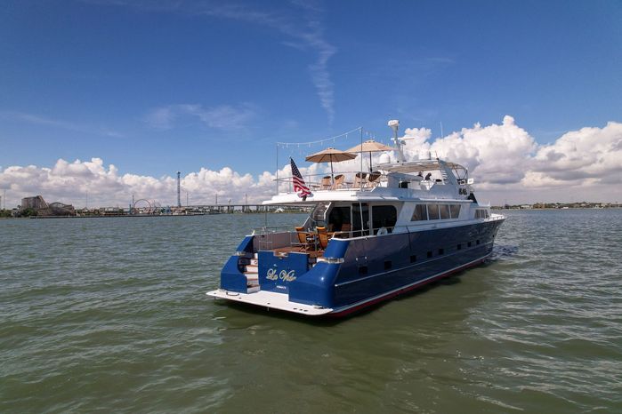La Vidas spacious flybridge is ideal for outdoor entertaining with comfortable seating for a large crowd. The Flybridge affords the helmsman 360-degree vistas and the extra large Bimini top protects all assembled. There are dual pedestal helm chairs and a full array of navigation equipment. The hinged mast allows access to more cruising routes. A large cabinet surrounds the mast and houses many storage lockers, a wet bar, icemaker, refrigerator and barbeque grill. There are Sunbrella cushioned settees both port and starboard, a teak table with chairs. Additional seating running full beam aft, is without cover and perfect for sunning.