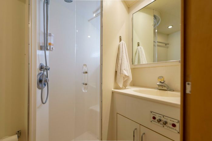 - The well-appointed salon boasts large windows for panoramic views and natural light, complemented by a fully equipped galley, including a stackable washer/dryer. The “standard arrangement” offers three comfortable staterooms, three heads' w/showers including a spacious master suite. “Querencia” offers plenty of room for family and guests all with 52 feet! All living quarters including the aft deck have split air conditioning units. Enjoy the convenience of the aft deck and swim deck for easy access to the water.